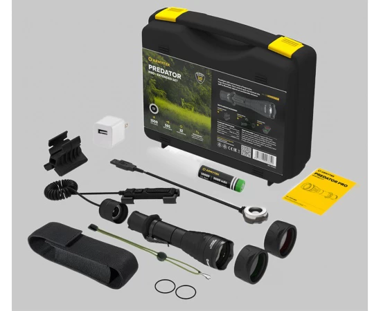 Az Armytek Predator Pro Magnet USB taktikai/vadász lámpa szett tartalmaz a lámpán felül minden olyan vele kompatibilis kiegészítőt ami alkalmassá teszi, hogy fegyverlámpaként használjuk. A taktikai lengőkapcsoló, mágneses szerelék elsősorban vadászati felhasználásra lett tervezve. A vörös szűrő az állatok egy részének szinte láthatatlan, de az éjszakai szem számára térképolvasáskor, valamint utánkeresés alkalmával is hasznos. A zöld-szűrős fénykéve oldalról nézve semlegesen/nyugtatóan hat az erdő állatai számára, ritkán riadnak meg a hatására.