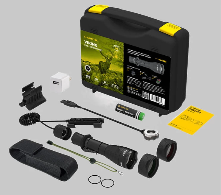 Az Armytek Viking Pro Magnet USB taktikai/vadász lámpa szett tartalmaz a lámpán felül minden olyan vele kompatibilis kiegészítőt ami alkalmassá teszi, hogy fegyverlámpaként használjuk. A taktikai lengőkapcsoló, mágneses szerelék elsősorban vadászati felhasználásra lett tervezve. A vörös szűrő az állatok egy részének szinte láthatatlan, de az éjszakai szem számára térképolvasáskor, valamint utánkeresés alkalmával is hasznos. A zöld-szűrős fénykéve oldalról nézve semlegesen/nyugtatóan hat az erdő állatai számára, ritkán riadnak meg a hatására.