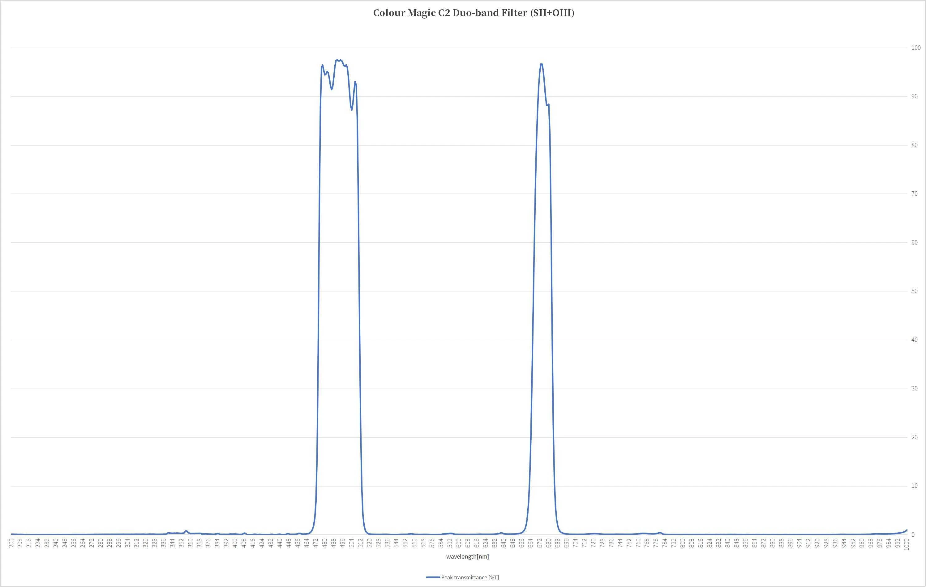 A SII tartományban a szűrő 15 nm sávszélességgel dolgozik, ami a 672 nm-es hullámhosszon nyújt kiváló teljesítményt. Az OIII tartományban pedig 35 nm sávszélességével a 500.7 nm-es hullámhossz környékéről gyűjti az információt, lehetővé téve a planetáris ködök és más oxigén-gazdag objektumok részletes vizsgálatát.