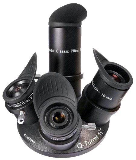 A Baader Q-turret okulárrevolver lehetővé teszi, hogy távcsövünkhöz használt okulárokat betárazzuk, és gyorsan, egyszerűen váltsunk köztük. Elsősorban lencsés távcsövekhez, vagy SC és MC távcsövekhez javasolt. Newton távcsövek esetén előfordulhat, hogy fókusznyújtás szükséges.