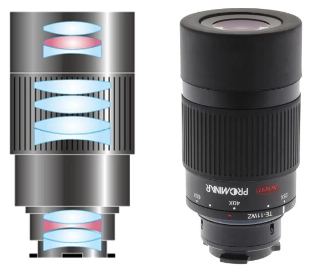 A Kowa TE-11WZ óriási látószöggel (1.32 - 2.4°) büszkélkedhet, a lencserendszer 2 db alacsony színszórású XD tagjai pedig a kromatikus aberráció okozta színezést csökkentik szinte nullára. Pupillatávolsága 17 mm.