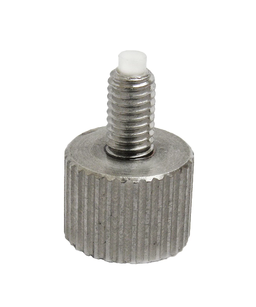 Metrikus csavar M3 menettel, 10 mm hosszban. A recézett fej segítségével nincs szükség külön szerszámra, kézzel is tekerhető. A csavar végén műanyag betétet találunk, ami rugalmassága révén megakadályozza, hogy a hegye karcolásokat okozzon.