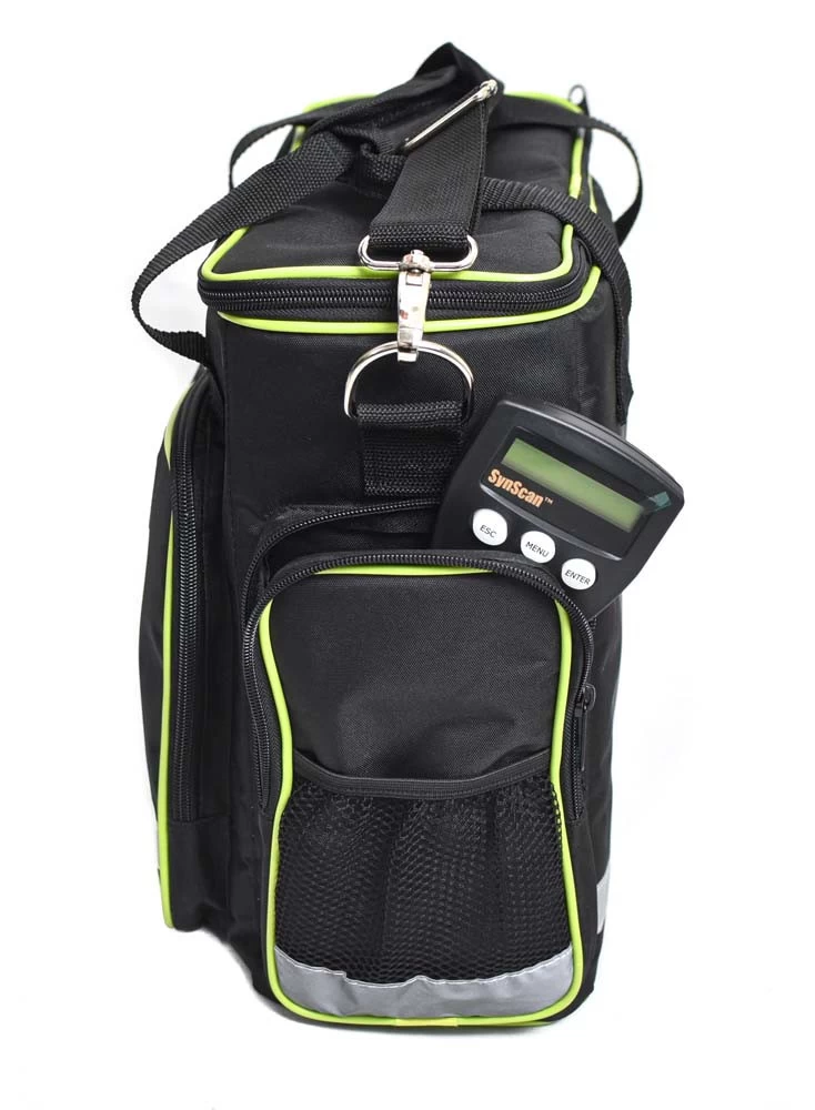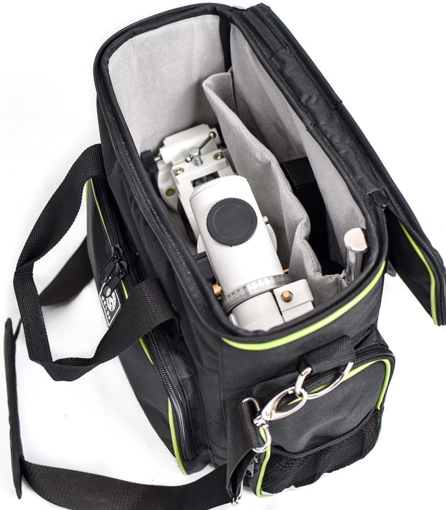 A hordtáska EQ-1,-EQ-5-ig terjedő ekvatoriális mechanika fejeket, valamint az AZGoto fejet képes elnyelni. A kisebb ekvatoriális mechanikák súlyai is elférnek benne, de az (N)EQ-5-é már nem. A jól átgondolt tervezésnek hála a táska zsebeiben is sok kiegészítőt tudunk tartani. A képek jól illusztrálják mi mindent tudunk a fej mellé még bepakolni.