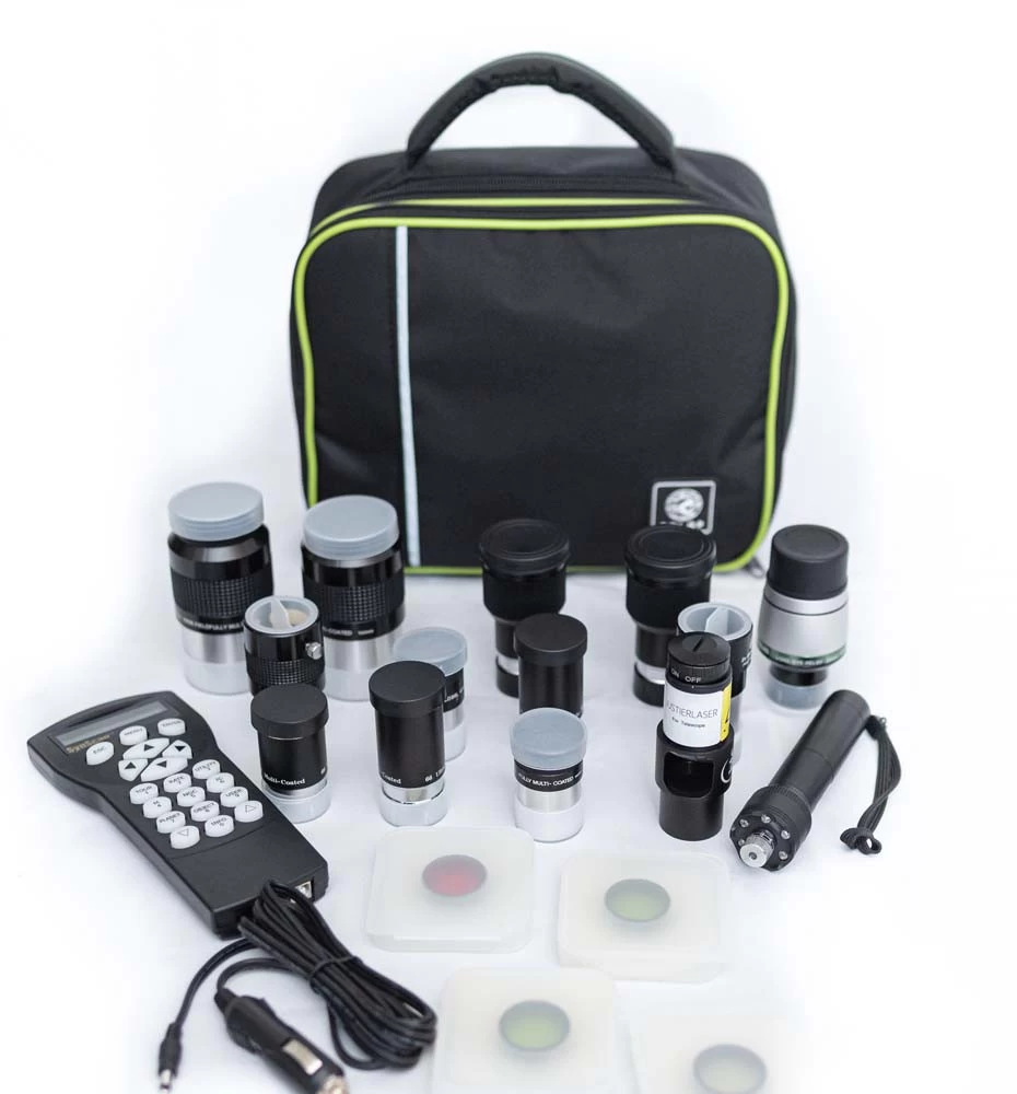A közepes hordtáskába 1.25-ös és 2"-os okulárok, zenittükör, szűrők és adapterek, észlelő atlaszok és még sok más apróság helyezhető, a külső-belső zsebeknek köszönhetően. A táska 5 mm vastag bélése és erős vászon borítása hatékony védelmet nyújt értékes kiegészítőink számára. A tépőzáras belső térelválasztók segítségével szabadon alakítható a táska belső elrendezése, igazodva a kiegészítők méretéhez.