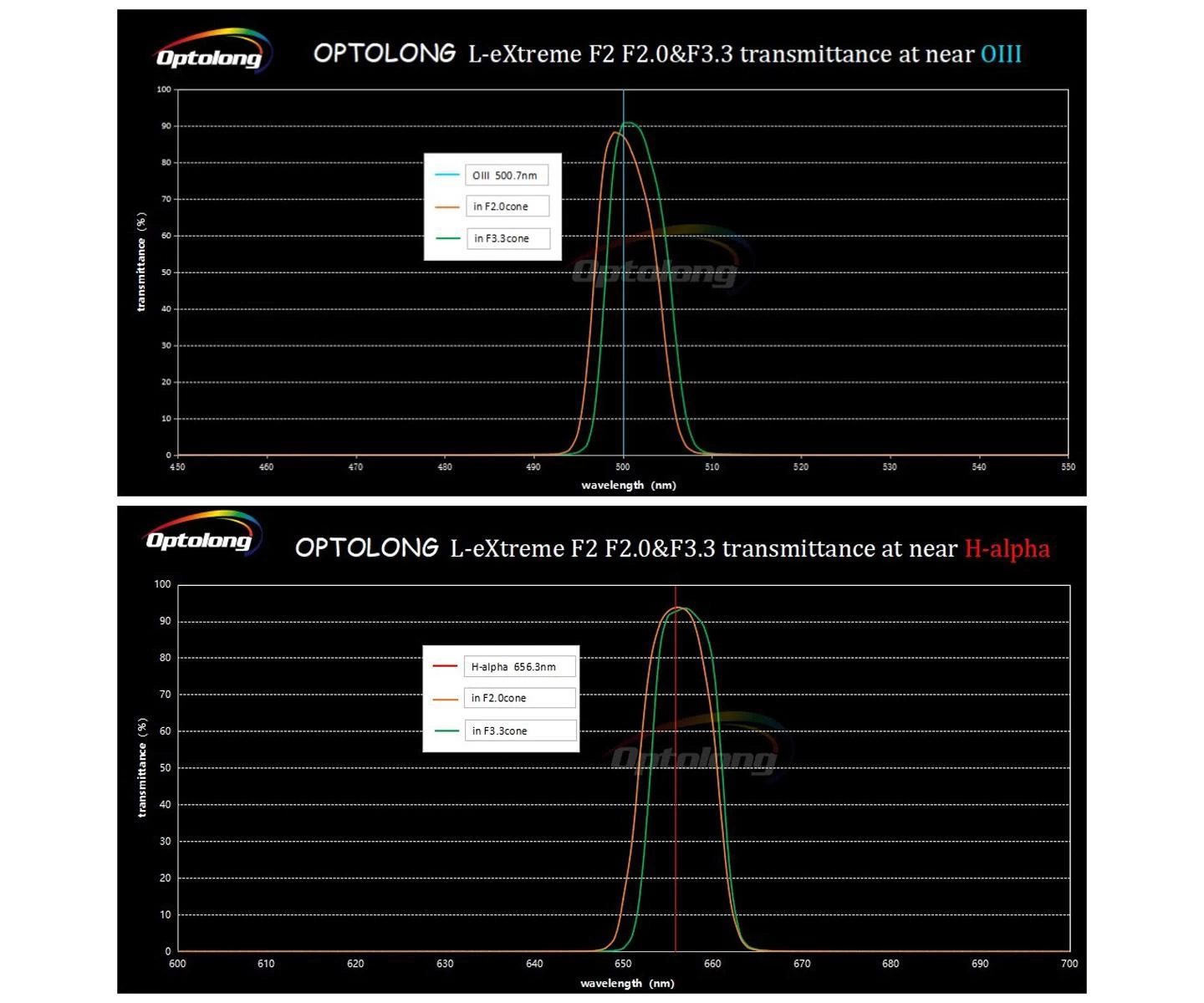 Az Optolong L-eXtreme F2 szűrőt speciálisan a fényerős (F2, F3) távcsövekhez tervezték, mint amilyen például a RASA távcső. Főleg színes csillagászati kamerák és DSLR fényképezőgépekkel történő használatra való. Lényegében két keskenysávú szűrő egyben: rendelkezik egy 7 nm sávszélességű, H-alfa hullámhossz-tartományra (656.3 nm) optimalizált áteresztési tartománnyal valamint egy másikkal az OIII tartományban (500 nm.) A diffúz ködök többsége ebben a két tartományban a "legfényesebb". A két keskeny áteresztési tartomány kiszűri a fényszennyezést illetve a zavaró holdfényt ezáltal egyedülállóan hatékonyan csökkenti a háttérfényeket a városi asztrofotósok számára.