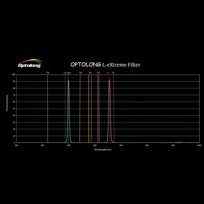 Az Optololong L-eXtreme keskenysávú szűrőt kifejezetten színes csillagászati kamerák és DSLR fényképezőgépekkel történő használatra tervezték. Lényegében két keskenysávú szűrő egyben: rendelkezik egy 7 nm sávszélességű, H-alfa hullámhossz-tartományra (656 nm) optimalizált áteresztési tartománnyal valamint egy másikkal az OIII tartományban (501 nm). A diffúz ködök többsége ezekben a tartományokban a "legfényesebb". A két keskeny áteresztési tartomány kiszűri a fényszennyezést illetve a zavaró holdfényt ezáltal egyedülállóan hatékonyan csökkenti a háttérfényeket a városi asztrofotósok számára.