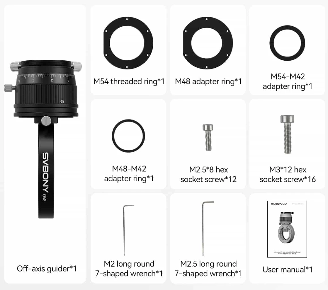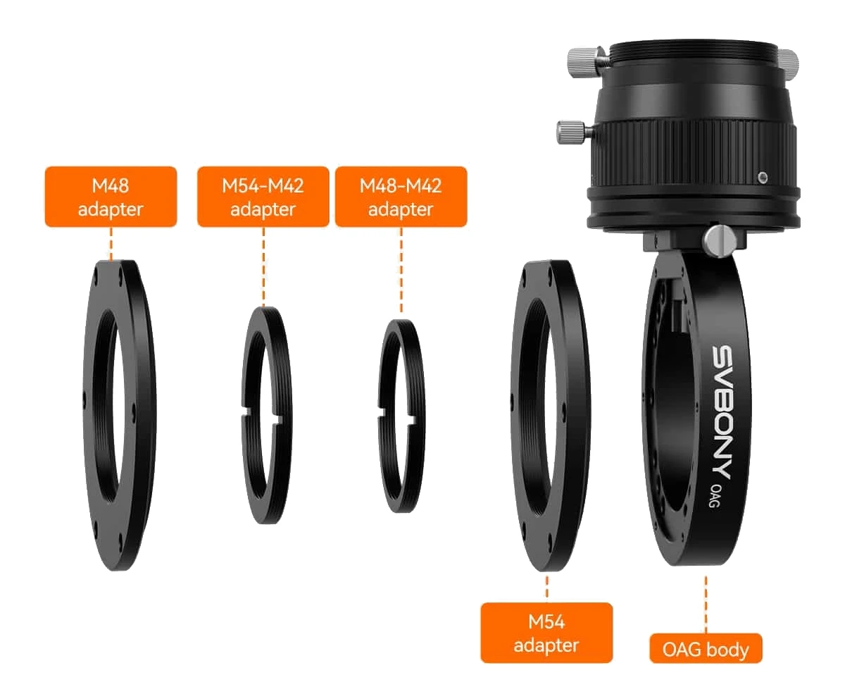 Figyelem! Az Svbony off-axis guider asztrokamerához való rögzítéséhez elengedhetetlenül szükséges az SV226P (M42) vagy SV226 (M54) szűrőfiók használata!