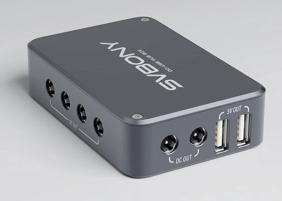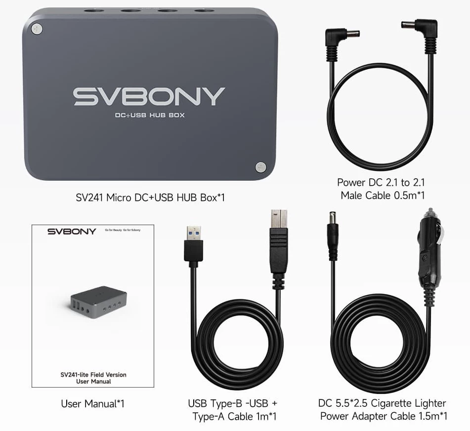 A Svbony SV241 USB-HUB és tápelosztó box rögzítésére 1/4"-os (fotóállványmenet) menetes furatot találunk a készülék alján, ezen kívül még két M4-es menetes furatot használhatunk erre a célra. A készülékhez három kábel jár, egy DC-DC, egy DC-szivargyújtó, valamint egy USB-B - USB-A kábel.