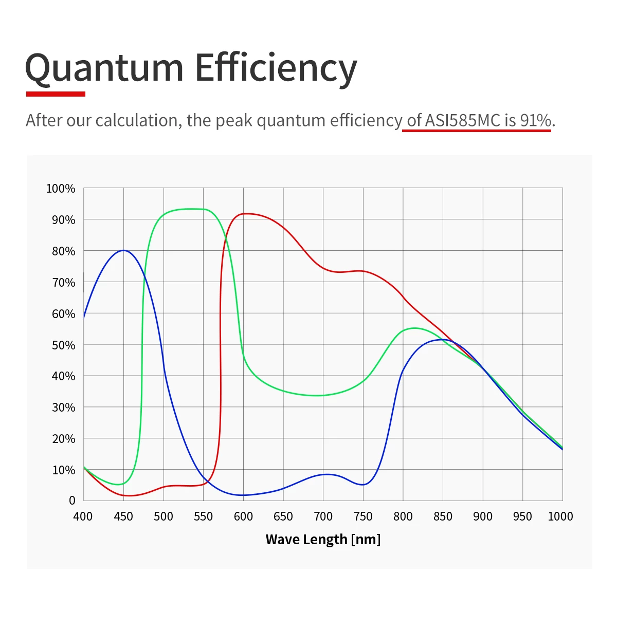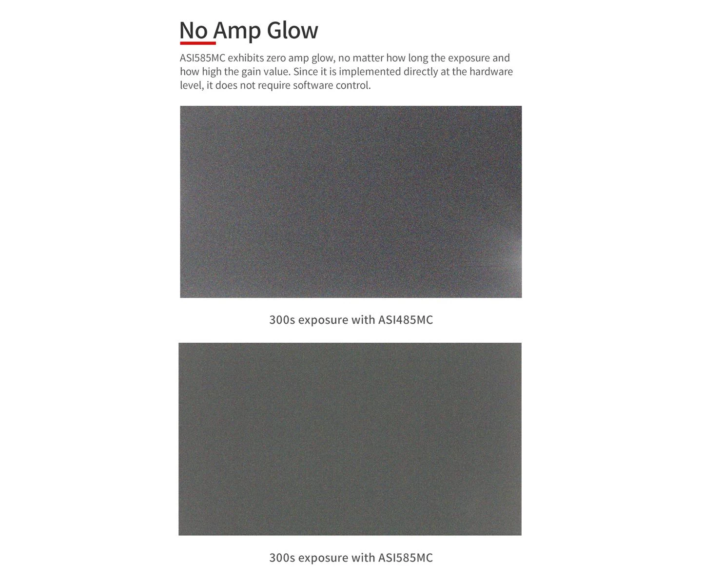A monokróm kamerákkal szemben a színes, úgynevezett "single shot" kamerák egyszerűsítik azok munkáját, akik nem az L-RGB színszűrős technikával szeretnének felvételeket készíteni. A  8 megapixeles (3840 x 2160) érzékelő extra alacsony kiolvasási zaja a hatékony zajcsökkentésnek hála magas erősítés esetén is alacsony zajszinttel működik hosszabb záridős felvételkészítés közben is. Hosszabb záridejű  felvételek esetén a korábbi kameráknál gyakran "befénylés" volt tapasztalható, amit csak utómunkával lehetett kompenzálni. A ZWO ASI 585 MC színes kamera használatával hosszabb (2000 másodperces) záridős felvételek készíthetőek alacsony zajszint mellett, miközben kiküszöbölték a jelerősítéskor tapasztalható "amp glow" vagy "befénylés" hatást is.