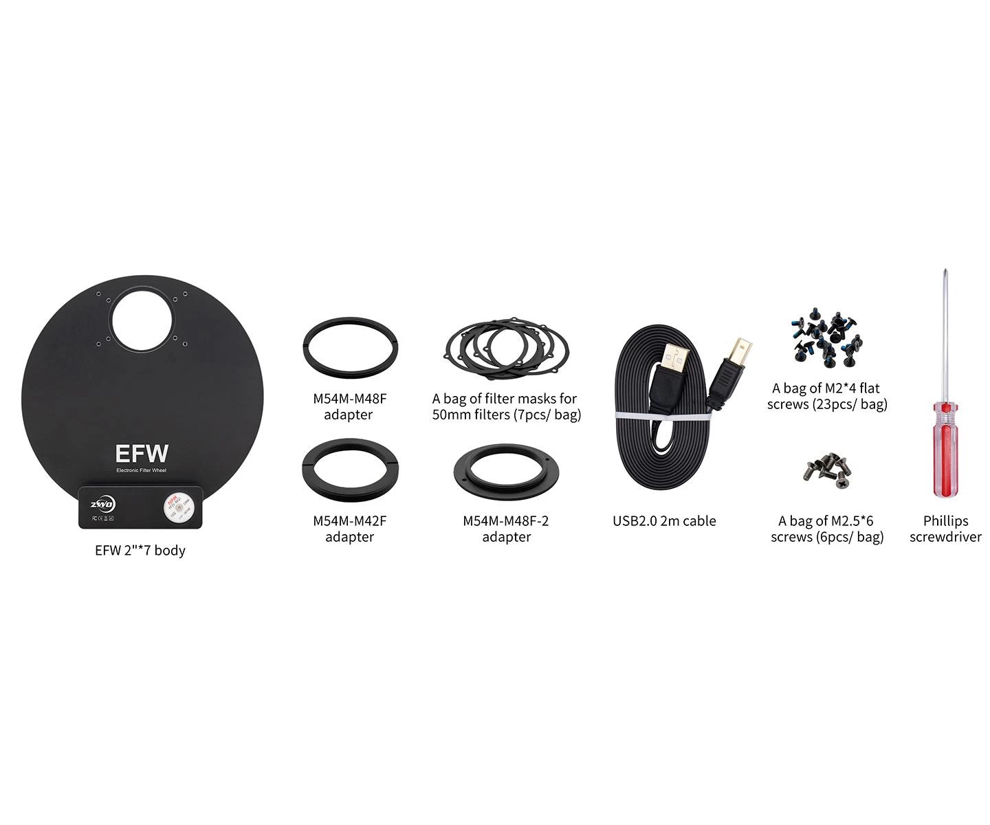 A szűrőváltón a távcső és a kamera illesztéséhez mindkét oldalon M54 (7×2" modell) menetet találunk. Számítógépre USB 2.0 porton keresztül csatlakoztatható, az ASCOM driverének feltelepítését követően pedig bármilyen ezzel kompatibilis szoftverrel vezérelhető. Szintén az USB 2.0 porton keresztül történik a szűrőváltó áramellátása is ezért nincs szükség több kábelre, elegendő egyetlen USB-kábel. A ZWO motorizált szűrőváltónak a maximális áramfelvétele körülbelül 120 mA @ 5V, amely lehetővé teszi hogy hűtött CCD kamera USB2.0 portjáról üzemeltessük. A csomagban M54/M48 és M54/T2 adaptergyűrűket találunk a különféle eszközök illesztéséhez.