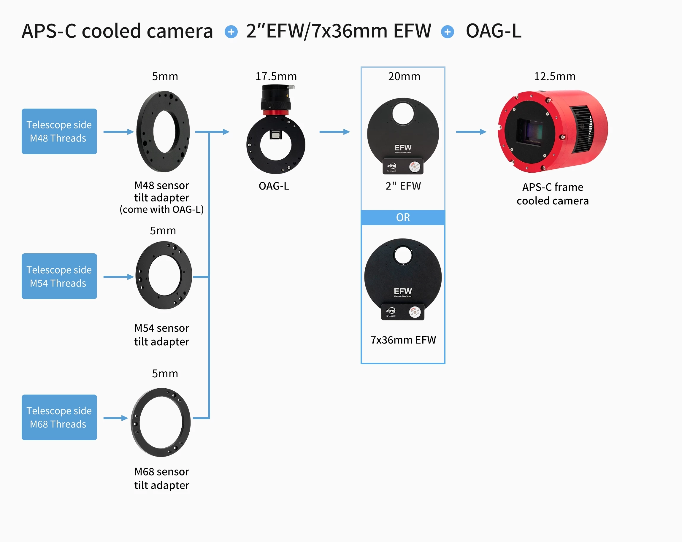 A ZWO nagy off-axis guider távcső felőli oldalán beépítve M48 fókuszsíkdöntő-egység található, melyet szükség esetén eltávolíthatunk. A kamera felőli oldalon az eszközt elsősorban a ZWO 2"-es szűrőváltójával való használatra tervezték, szűrőváltó nélkül plusz adapter (ZWO OAG-L / M54 adapter) szükséges az illesztéshez.